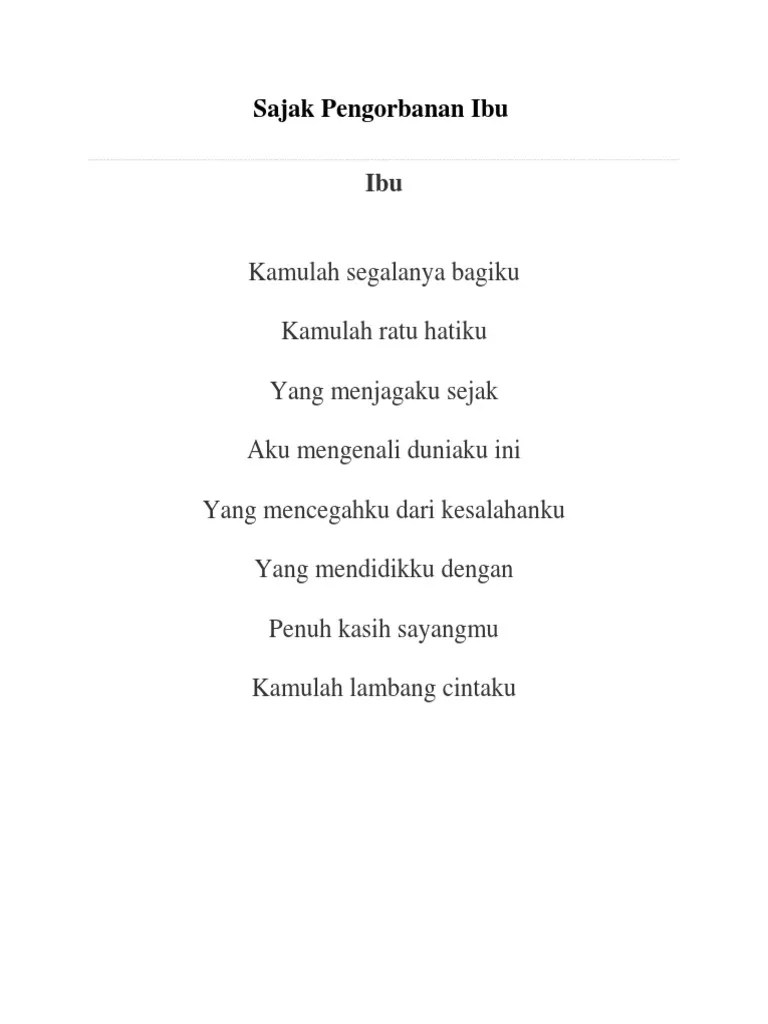 Pengorbanan seorang ayah dan ibu. Cari puisi ibu dan ayah kumpulan puisi. Ibu, perngorbanan mu tidak terbalas rasanya… sejak aku di dalam kandunganmu, Begitu banyak pengorbanan seorang ibu dan ayah untuk kita. Sajak bintang karya siti zaleha m. Ibu ayah bergenang air mataku terbayang wajahmu yang redup sayu kudusnya kasih yang engkau hamparkan bagaikan laut yang tak bertepian biarpun kepahitan yang . Ibu ayah bergenang air mataku terbayang wajahmu yang redup sayu kudusnya kasih yang engkau hamparkan bagaikan laut . Ada yang sedih, mengharukan, ceria, dan menyentuh hati. Dan ayah yang sudah membesarkan kita. Kehidupan berawal dari rumah dimana ayah . Ibu dan ayah adalah dua sosok yang tidak bisa dipisahkan, kkarena dari keduanya kita anaknya lahir. Puisi ibu dan ayah singkat menyentuh hati merupakan ungkapan perasaan terdalam kita untuk kedua orang tua kita dalam bentuk kata kata puisi . Seronoknya belajar bahasa melayu sajak ibu dan bapa. Daftar isi puisi kepada orang tua :